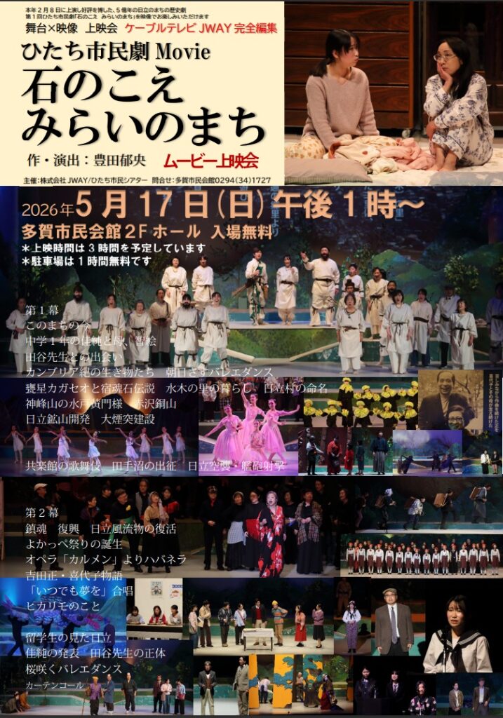 175780770801917578077082251757807708339175780781141617578078115741757807708310 ひたち市民劇 石のこえ みらいのまち 令和8年2月7日(土)~2月8日(日)多賀市民会館ホールにて上演 去る2月7日、8日に開催いたしました、ひたち市民劇「石のこえ みらいのまち』には、ご多忙中にもかかわらずご来場いただき、誠にありがとうございました。 おかげさまで、延べ530人のお客様をお迎えし、温かい拍手の中で無事に幕を閉じることができました。アンケートでいただいた「予想していたものをはるかに超えていました。再演を!」というお言葉は、キャスト一同にとって何よりの励みとなっております。 まだまだ未熟な私たちですが、今回の経験を糧に、より一層心に響く舞台を目指して活動を続けてまいります。今後とも変わらぬご支援を賜りますようお願い申し上げます。